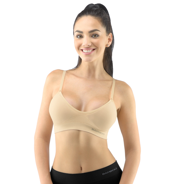podprsenka sportovní s vycpávkami, bez kostice, bezešvé, jednobarevné značky GINA, kód 07021. Barva: tělová , Velikost: L/XL, Složení: 80% Viskóza ( Bambus ) 16% Polyamid 4% ElastanPodprsenka bez kostic s vyjímatelnými vycpávkami a nastavitelnými ramínky, dámské bezešvé sportovní prádlo. Dolní kraj je zesílený a zapravený bezešvým způsobem. Horní kraj je zapravený lemovkou. Přední díl je dvojitý a mezi vnější a vnitřní část jsou vloženy lisované košíčky. Zadní díl je v celku. Ramínka jsou nastavitelná a díky použitým háčkům lze změnit jejich umístění na zadním díle. Podprsenka je jednobarevná. V záložce je vypletené logo.Materiál je vyroben z bambusového vlákna, které je doplněno elastanem. Úplet je velmi jemný a příjemný na nošení. Do každodenního prádla přináší luxusní hedvábný vzhled.Luxusní kolekce bezešvého prádla ECO Bamboo má nejvyšší podíl bambusového vlákna. V této kolekci jsme se zaměřili na ekologické zpracování jak samotného vlákna, tak postupů při barvení a konečné úpravě textilie. Prádlo je baleno v ekologických sáčcích a doplněno krabičkou bez laminace.. Kolekce: Eco Bamboo
